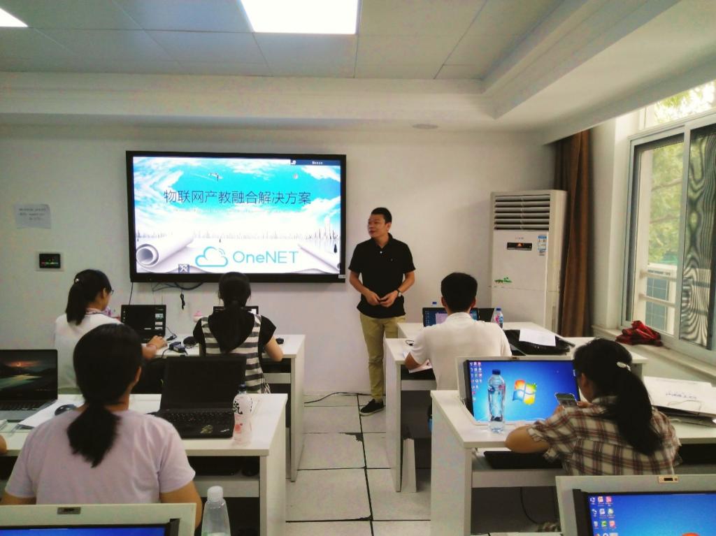 在下午的课程中,由负责技术培训的中移认证讲师高超博士和何栩翊高级工程师为大家详细阐述了培训的主要内容和目标。高超博士指明,培训中是以案例分享及实际操作或体验方式进行授课,将理论与实践紧密结合,让学员能够快速熟悉并运用NB-IOT开发板和OneNET平台,便于今后各单位物联网相关课程建设及OneNET应用的拓展与提升。同时何栩翊老师详细介绍了OneNET平台的起源与发展,为后期项目实战作好了背景铺垫。