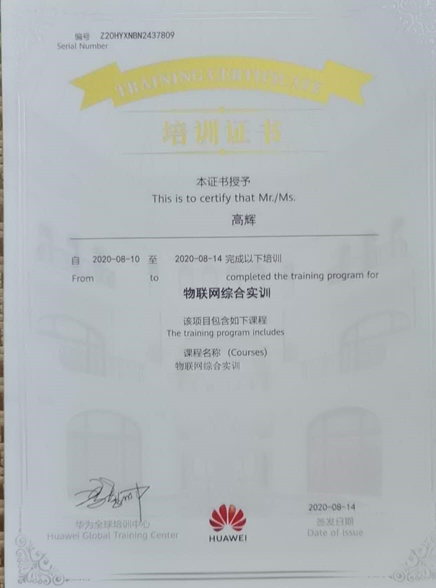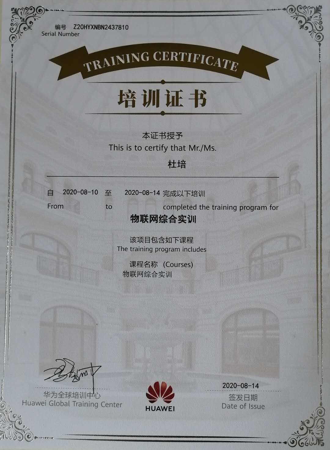 当前科技发展十分迅速,电子信息及物联网新技术应用层出不穷。秉承高质量实施“双高”专业建设任务要求,学院“走出去引进来”同步进行,加强与行业领军企业的联系互动。8月10日至15日,华为全球培训中心在杭州市举办了物联网综合实训培训班,HAHA体育信息工程系专任教师杜培、高辉利用暑期空档,前往参加培训,力图为团队队伍等专业建设进程添砖加瓦。
