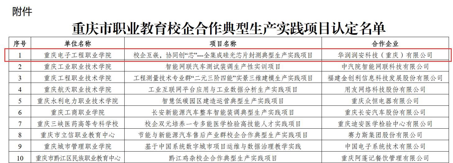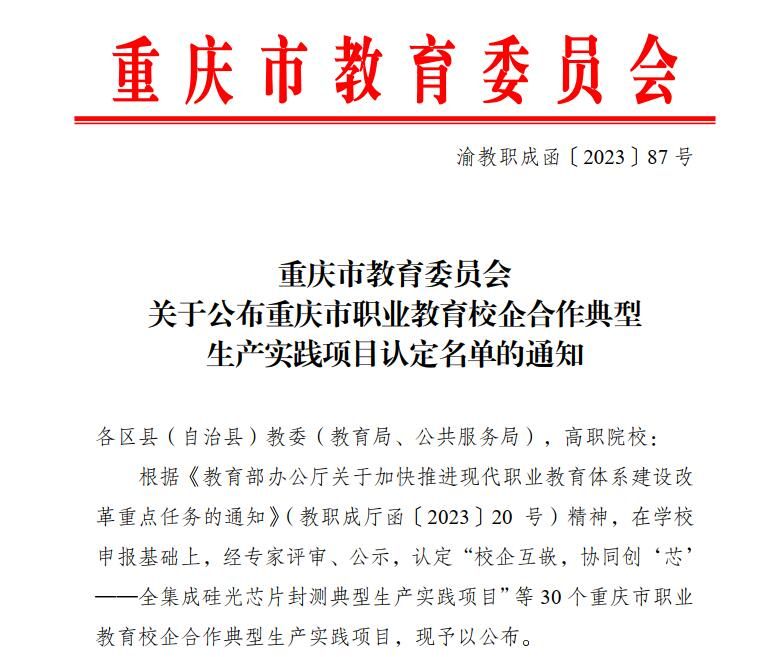 近日,重庆市教育委员会发布《重庆市教育委员会关于公布重庆市职业教育校企合作典型生产实践项目认定名单的通知》,公司“校企互嵌,协同创‘芯’——全集成硅光芯片封测典型生产实践项目”等30个项目入选重庆市职业教育校企合作典型生产实践项目。