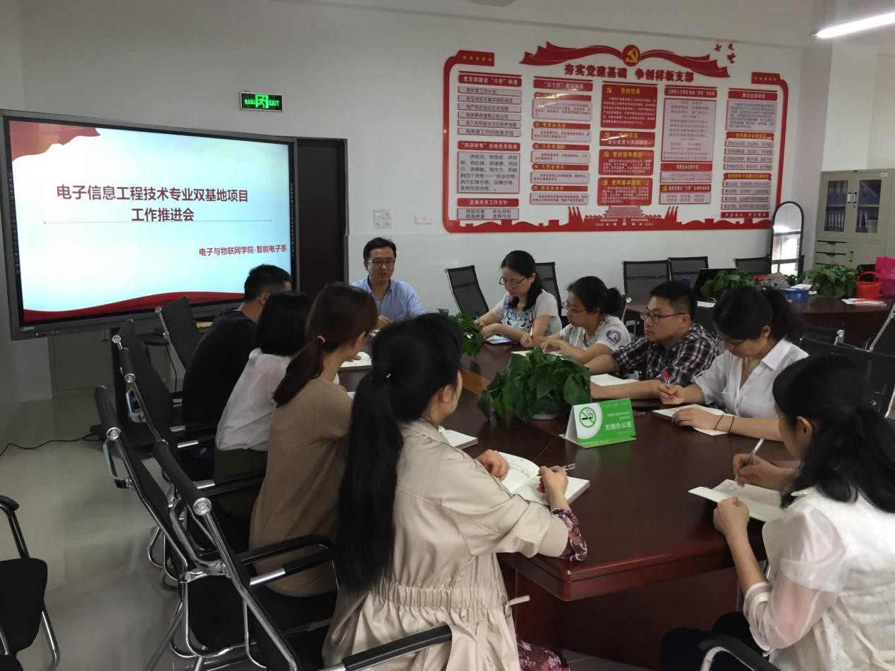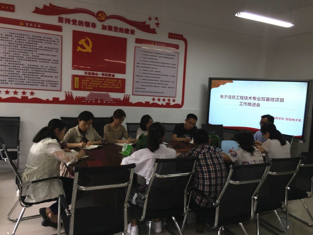 2019年4月28日中午13:00,为迎接双基地项目中期检查,智能电子系在12207教师创新发展中心召开电子信息工程技术专业双基地项目工作推进会。会议由王用鑫主任主持,双基地项目10位主要成员参加了本次会议。