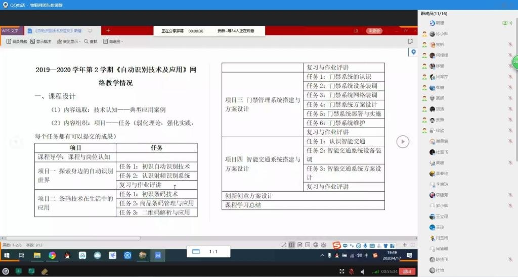 4月17日星期五晚19:00-21:30,为更好地对近半学期来团队教师开展线上教学所取得的经验进行交流和总结,信息工程系与物联网应用系通过QQ群视频方式,围绕在线教学的课程设计、教学实施、教学效果与反馈、教学反思、线上教学平台及教学工具选用等多方面开展阶段性研讨与分享交流活动。交流活动由信息工程系主任徐小辉博士主持,与会老师结合自己半学期来的相关教学实践和过程总结进行积极发言分享。