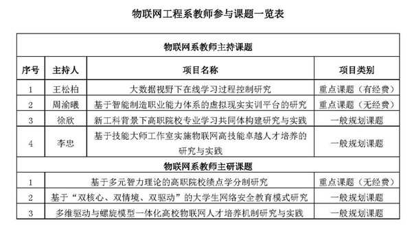 在本次重庆市教育科学“十三五”规划2018年度课题申报中,重庆电子工程职业学院总计立项22项,HAHA体育物联网工程系参与立项的课题数高达7项,占学校总立项数的31.8%,其中,有经费的重点课题1项,无经费的重点课题2项,一般规划课题4项,参与人数超过20人次。本次科研项目立项工作取得突破,与电子与物联网学经理期重视教学改革、努力实现教学创新分不开。物联网工程系将继续扎根教学研究,立足应用实践,提高团队教师的教学研究能力,提升物联网的教学科研工作水平。