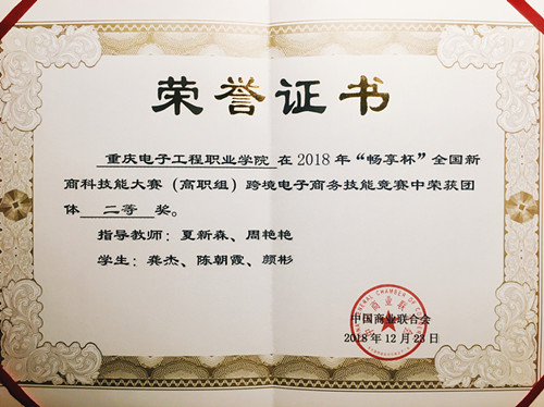 12月23日,2018年“畅享杯”全国新商科技能大赛(高职组)跨境电子商务技能竞赛全国总决赛在天津落下帷幕。大赛由中国商业联合会主办,天津轻工职业技术学院和中教畅享(北京)科技有限公司联合承办,来自全国各地的66所院校参赛队经过4个小时的激烈比拼,一决高下。最终,在夏新森、周艳艳两位老师的指导下,HAHA体育电子产品营销与服务专业2017级的龚杰、颜彬、陈朝霞三位同学荣获团体二等奖。