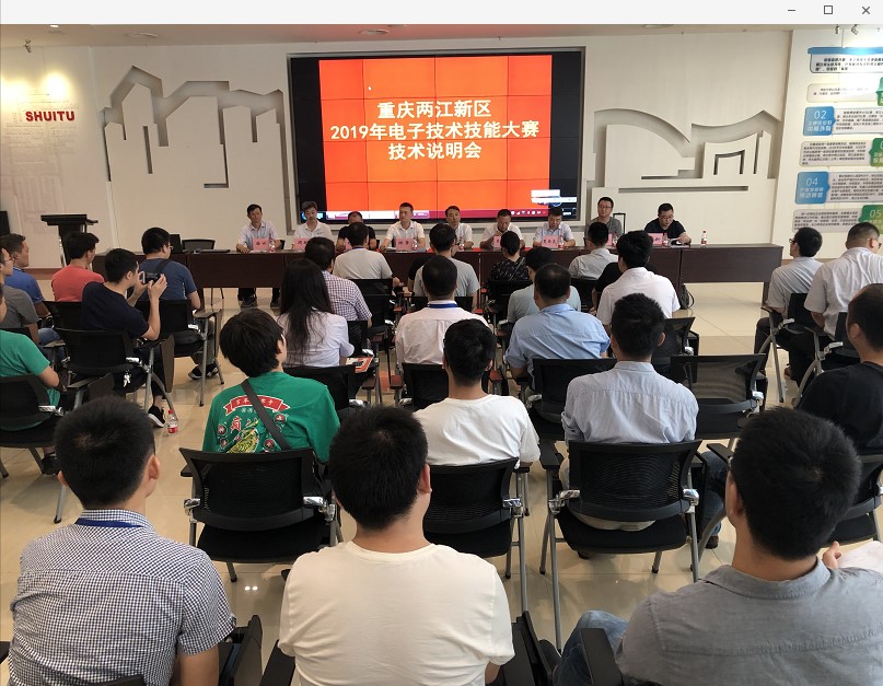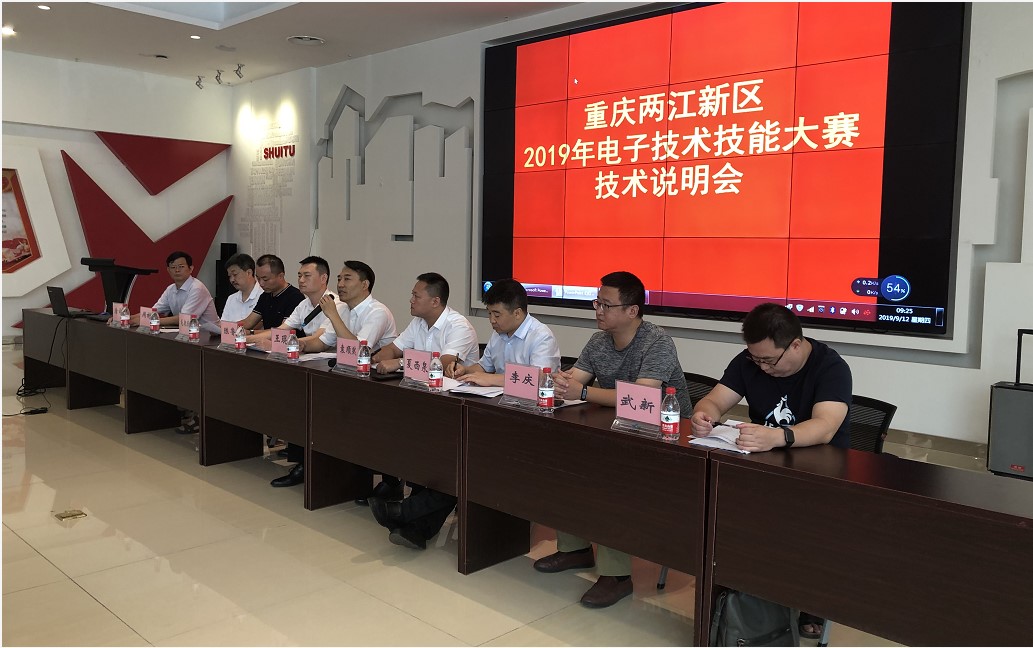 2019年9月12日,应重庆两江新区管委会邀请,由HAHA体育夏西泉副经理带队,毛朝庆、唐云、武新、周彬、李庆五位赛项负责老师组成的技术支持团队到重庆两江新区水土园区党群服务中心会议室,参加了重庆两江新区2019年电子技术技能大赛技术说明会。