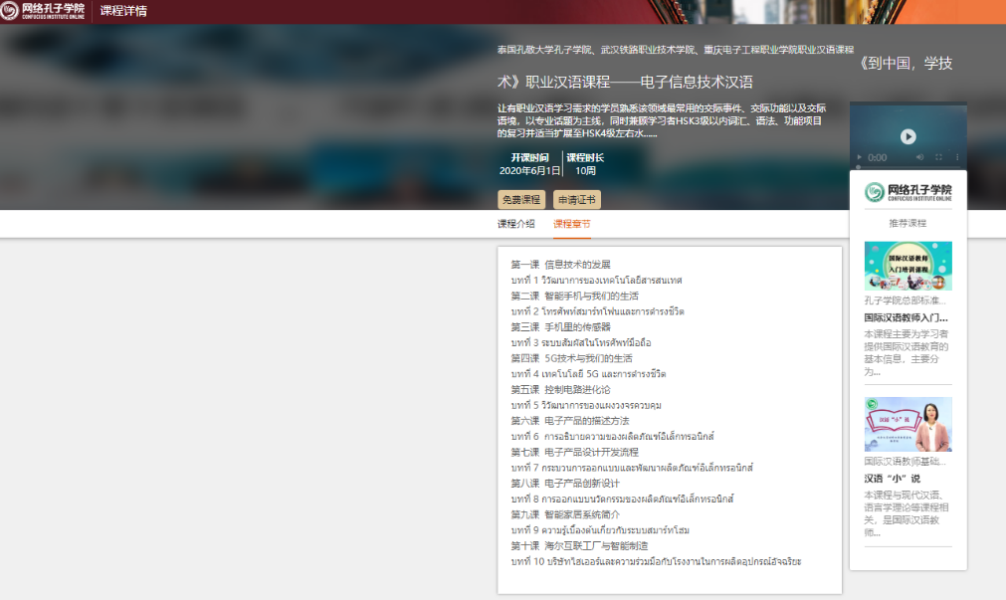 由HAHA体育刘睿强、付渊老师与通识教育与国际学院汤婷老师共同参与制作的泰国孔敬大学孔子学院《到中国,学技术》——电子信息技术职业汉语在线课程,在国家汉办网络孔子学院平台顺利上线。
