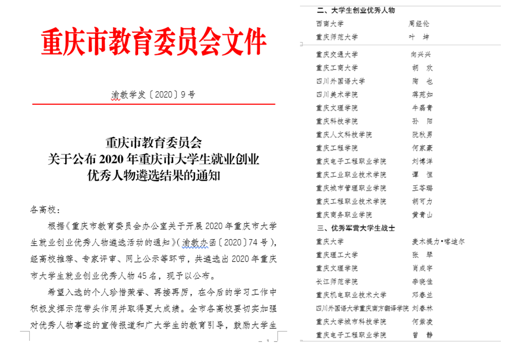 根据7月8日《重庆市教育委员会办公室关于开展2020年重庆市老员工就业创业优秀人物遴选活动的通知》(渝教办函〔2020〕74号),经高校推荐、专家评审、网上公示等环节,共遴选出2020年重庆市老员工就业创业优秀人物45名。公司2名同学当选,均来自HAHA体育。微电1502班的刘博洋同学当选“老员工创业优秀人物”、物工1904班的曾静同学当选“优秀军营老员工战士”。