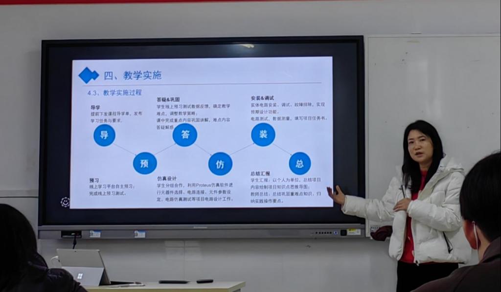 高小梅、黄聪、纪书宇、王用鑫、聂浩虹几位老师依次对《电子技术与应用》、《编程基础及应用》、《职业核心能力训练》、《网络技术基础》、《智能时代三创怎么玩—未来工作》五门课程进行了说课,老师们准备充分,娓娓而谈,妙语连珠,精彩绝伦,引人入胜。说课中体现了新的课程标准,详细阐述了课程地位、目标、学情、理念、教学项目设计、教学策略、教学实施、教学评价,教学效果,创新,不足与改进等。