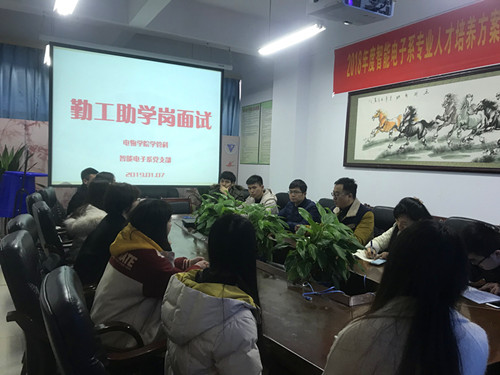 应聘同学早早来到面试场地,为即将到来的面试考核做最后准备。7215会议室里,智能电子系勤工助学岗位面试正在紧张进行。王用鑫主任向参与面试的同学详细介绍了岗位职责和要求,并对面试流程作说明。随后,应聘该系勤工助学岗位的10名同学一一向面试官作自我介绍,表达自己对学习、任课老师、辅导员、勤工助学、校园环境等多个方面的看法和理解。面试老师则主要从员工家庭、学习情况、组织沟通、语言表达等方面来考察员工的综合素养。最终,智能电子系择优录取了3名同学。同时,其他系、科32个岗位名额也全部录齐。