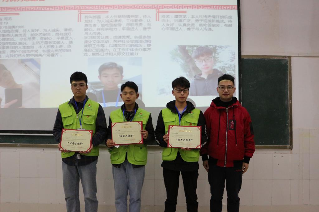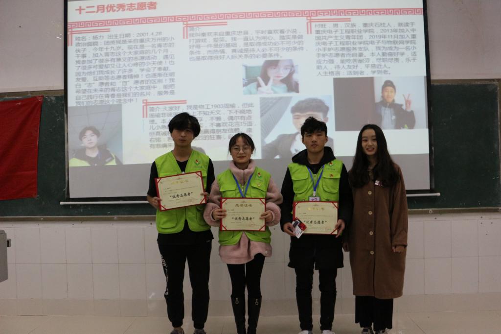 重庆电子工程职业学院HAHA体育“小手炉”志愿服务支队优秀志愿者表彰大会于2019年12月30日在教学楼7-208召开。参加本次会议的有公司团总支书记聂浩虹老师、各二级学院志愿服务支队代表、公司员工会干部以及“小手炉”志愿服务支队志愿者们。
