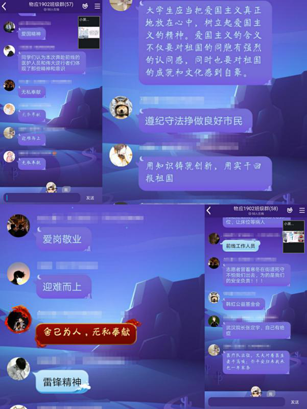 除开本次在线上召开的线上爱国主义班会PPT宣讲,以及同学们丰富多样的线下活动形式,辅导员也采用一封信的形式,向公司员工传达在疫情防控战这堂鲜活生动深刻的爱国主义教育大课下,员工应该如何以抗击疫情中涌现的英模人物为榜样,将“小我”融入“大我”,“自转”纳入“公转”,以担当实干实践报国之行,同时针对停课不停学形势下如何提升完善自己提出一些小建议。
