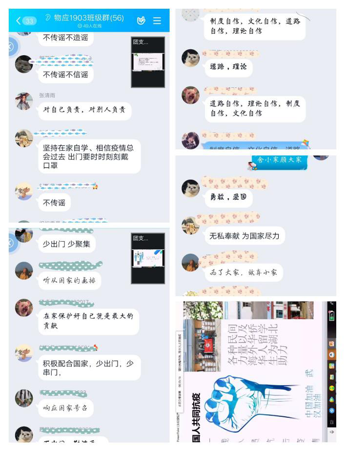 向同学们讲解了中华民族精神的核心:爱国主义精神的表现和作用,并让我们说出身边爱国主义的表现形式。播放关于爱国主义的抖音短视频,让同学们去感受平民英雄的爱国之心。期间互动让大家列举当前疫情中“美丽逆行者”的感人事迹,员工就了解到的时事积极在班群中发言。员工纷纷表示,面对疫情,每个人都深切感受到家国情怀和社会主义大家庭的温暖。在这种爱国主义精神的引领下,我们必将取得这场战斗的胜利。