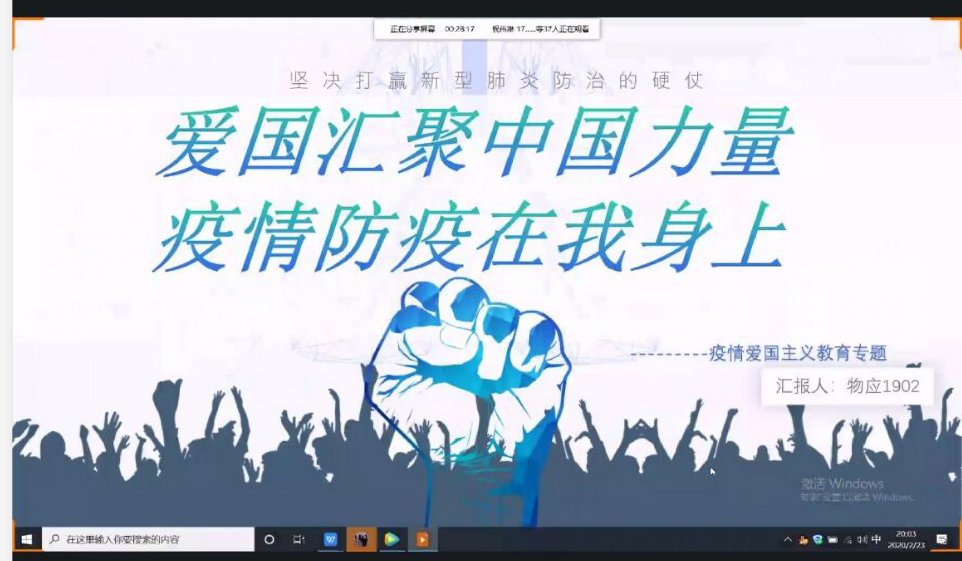 2020年初新冠病毒肆虐神州大地,为了避免疫情蔓延,保护师生生命安全,各地学校纷纷延迟开学,避免返校人群聚集。为深入贯彻落实习近平总书记关于打赢疫情防控阻击战的重要指示精神,同时响应教育部党组关于在教育系统扎实开展爱国主义教育的发文,利用“疫情防控”这堂爱国主义教育大课,教育引导广大师生从感性到理性、从自在到自为,激发爱党爱国爱社会主义的巨大热情,凝聚奋进新时代、实现民族复兴的磅礴伟力。HAHA体育响应公司进一步加强老员工思想政治教育工作的一项重要举措,于2020年2月召开关于“众志成城、抗击疫情”的线上主题班会。