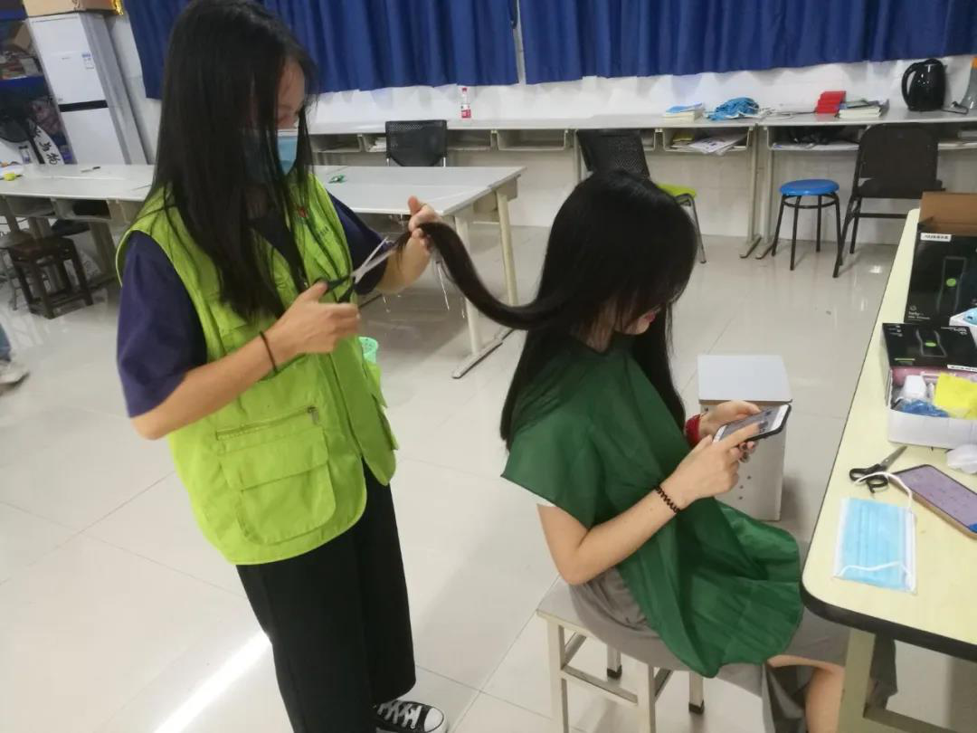 负责人在志愿服务总群里发布招募理发师的消息后,同学们踊跃报名,将自己的基本信息发给负责人后,加入到了这次义剪的行列中。为了更好的利用时间,创建了专门的剪发群,采取了一对一的模式,在剪发群里进行预约时间再剪发。在此次义剪中,报名参加的志愿理发师共有39名,已有两名HAHA体育的同学完成了预约剪发,活动室里几把椅子并排,一个简易的理发室产生了,志愿者们与需要理发的同学协商完毕后,麻利的开始理发,他们迅速的将理发布披在我们剪头发的同学身上,然后右手拿一把电动理发器,左手拿一把梳子,按住需要剪的部分,在突出头发的地方用理发器轻轻一滑,一撮头发就缓缓落下,又拿出一把银白色的剪刀,用同样的方法,把那些细小的地方剪掉,不一会儿,一个干净利落的发型就修剪完成,同学们都不由竖起了大拇指,这是一场特别的志愿服务活动。