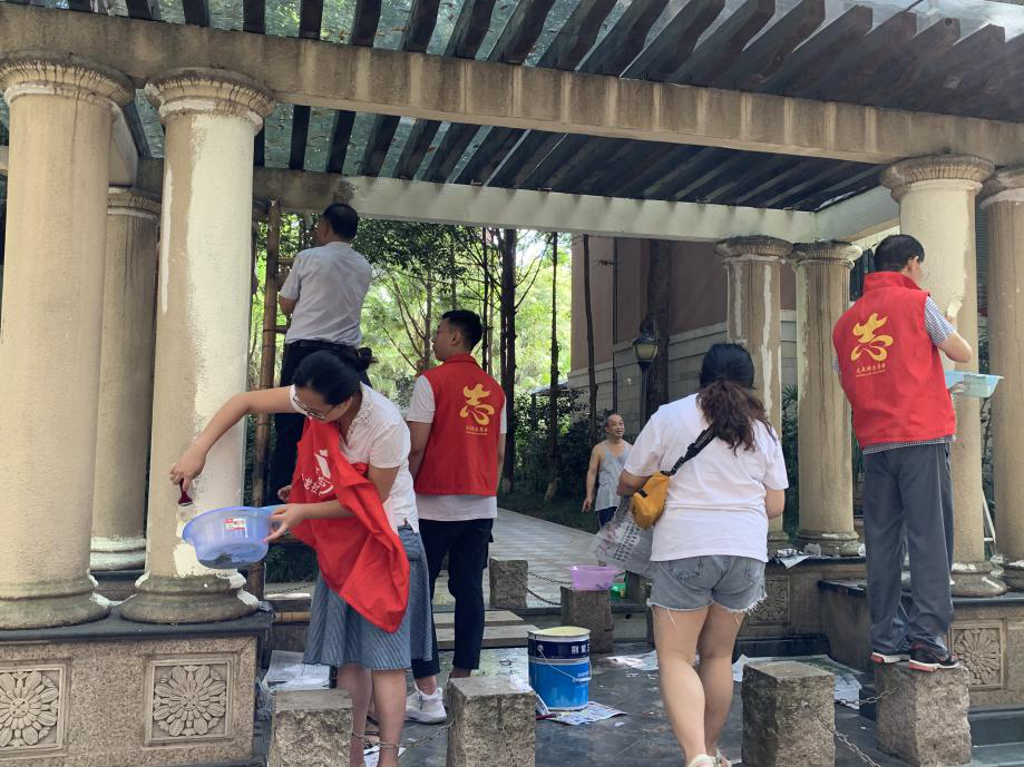 图为志愿者们与社区干部一起对小区内连心亭进行外墙刷漆翻新。中国青年网通讯员 谢睿杰 摄