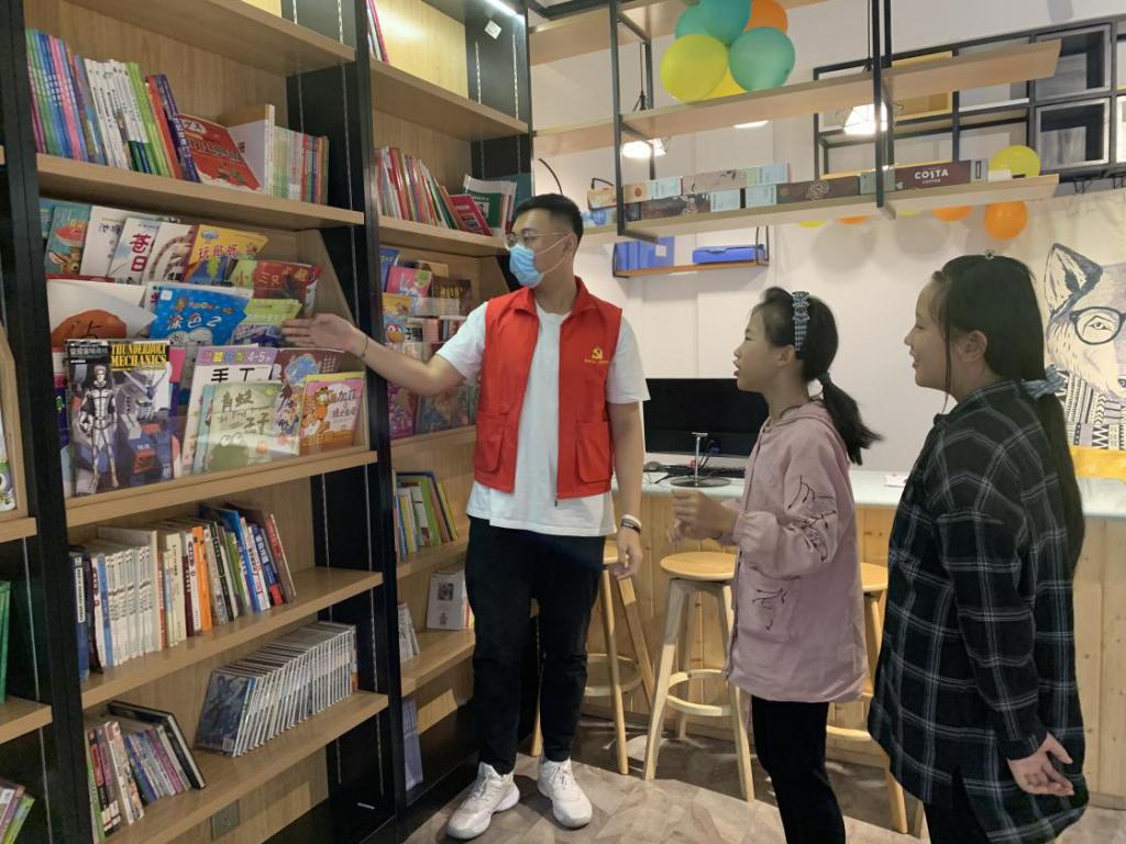 图为志愿者为小朋友介绍南悦书吧。中国青年网通讯员 谢睿杰 摄