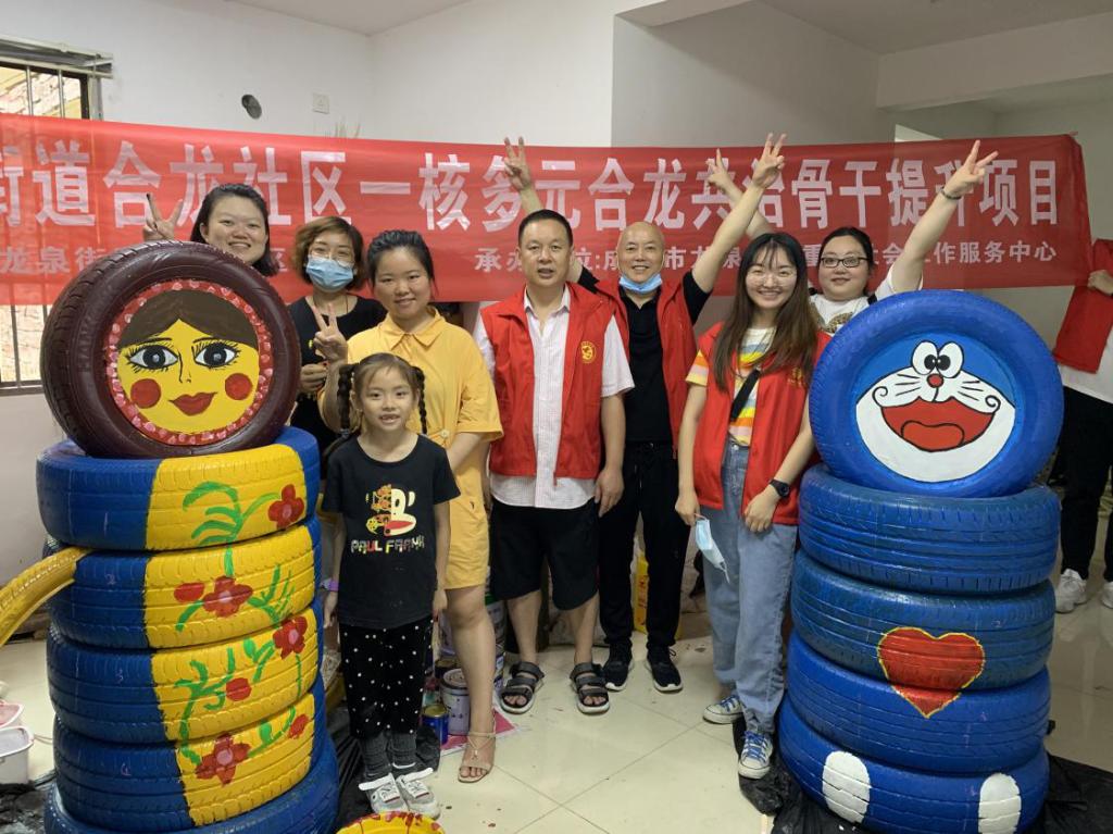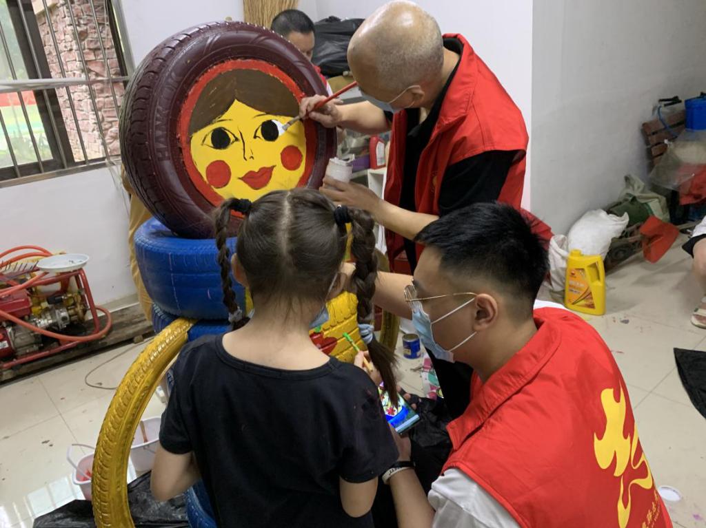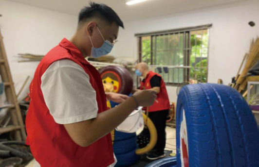 图为志愿者正在进行“轮胎大变身”,将一个个黑乎乎的轮胎变身为造型独特新颖的宝贝,为社区文化环境增添一份色彩。中国青年网通讯员 谢睿杰 摄