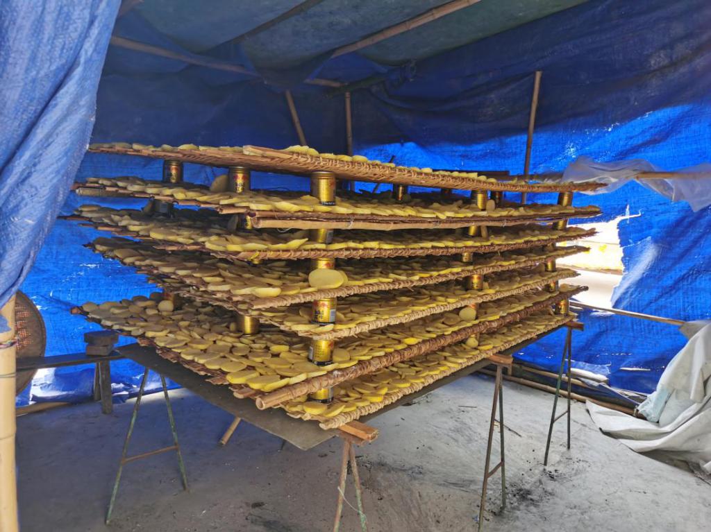 土豆又称洋芋,是奉节县粮食种植业“大户”,即使粮食结构不断调整,仍属“特色产业”,“洋芋情怀”无处不在。当队员们来到长凼村时,道路两旁的景象深深地吸引了小组成员的眼球,队员们发现,长凼村几乎家家户户门口都搭建了专用“炕房”,里边摆放着凉席或木板,上面铺满了新鲜的洋芋块儿,在阳光的照射下,散发着耀眼的金色和清香的气味。