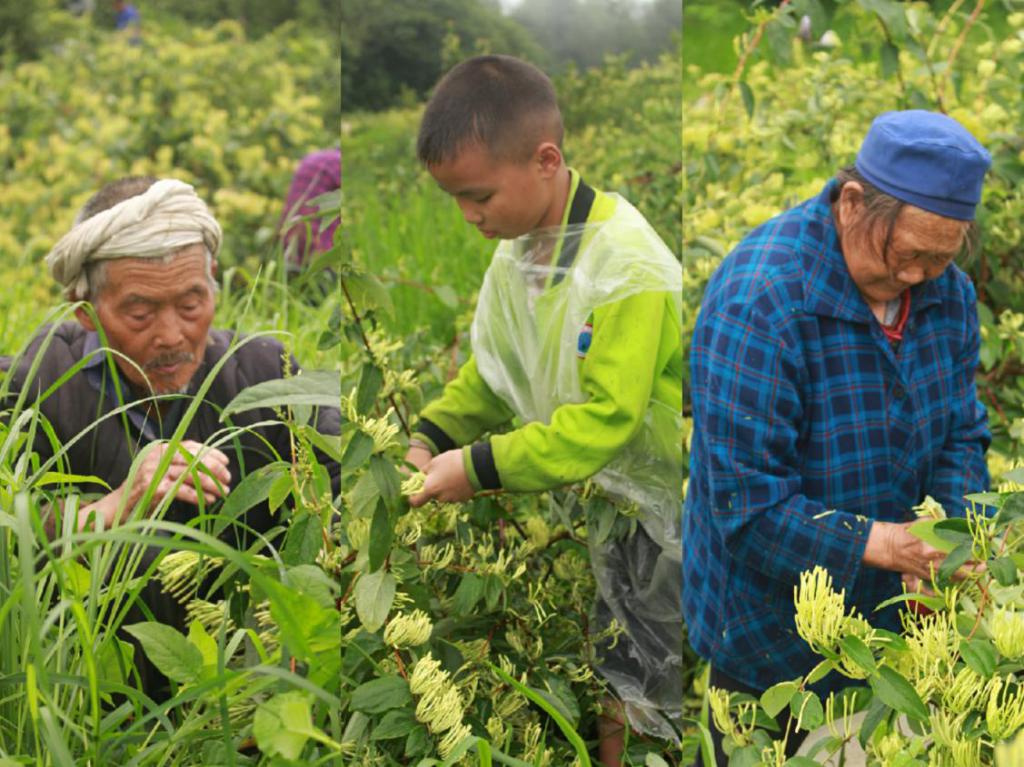 在石柳乡建栏村,队员们跟随着乡亲们伴随着金银花散发的阵阵清香,一路走到山顶,映入眼帘的是漫山遍野的金银花和田间地里低头忙碌采摘的村民们。为了在最佳时间段采摘金银花,队员们采访了李阿姨,她十分热情地向大家介绍村里的情况,乡亲们早上5、6点钟就开始采摘,今年雨水特别丰富,尽管飘风急雨各位村民们依然在地里埋头苦干,“有露水和下雨天不适合采摘,上午和中午以后采的花青白色质重,容易干燥,香气浓厚,出商品率高,质量好。阴天采摘的花质较差,加工率低”目前乡亲们以及基地内也全都是手工采摘,费时费力,花费一整天每人也只能采摘二三十斤,为了能保证地道的金银花药材的品质,金银花全部采用“杀青烘干方式”更加保证了药用成分的含量。