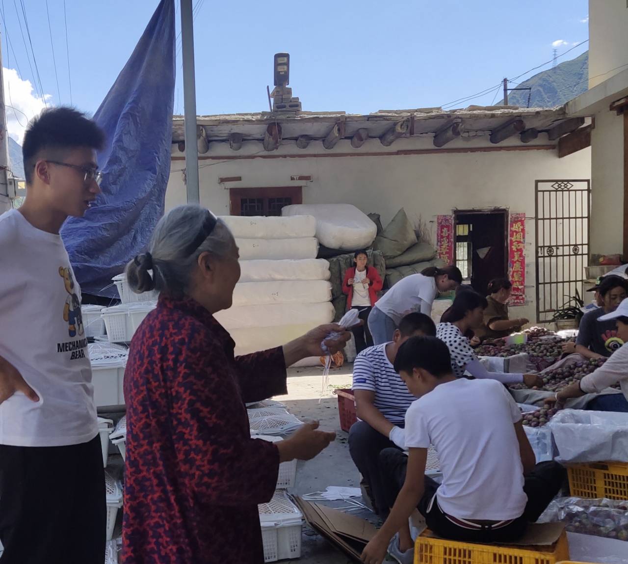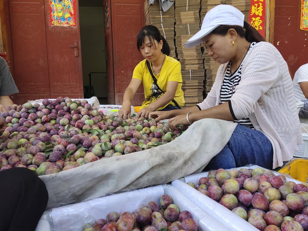 图为返家乡实践小组成员在当地果农的指导下,和大家一起对刚刚采摘下来的李子进行筛选、分装。中国青年网通讯员李洋摄