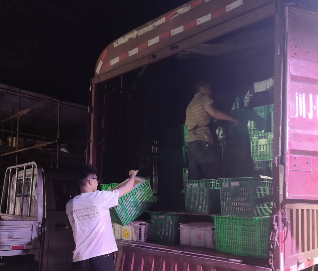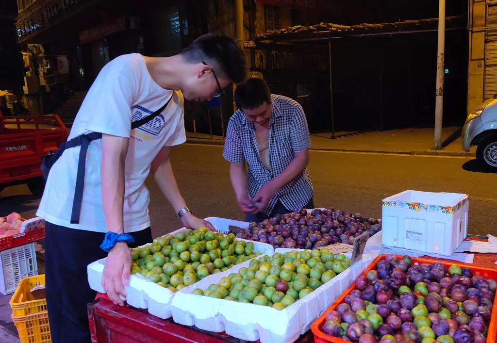 图为晚上返家乡实践小组成员帮助当地果农给来村里收李子的采购商装车上货。中国青年网通讯员蒋雷摄