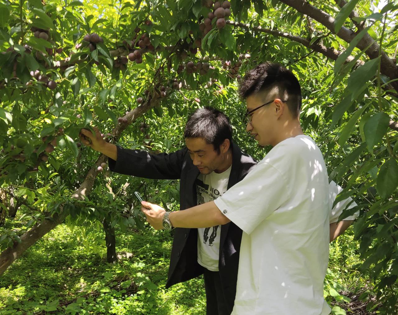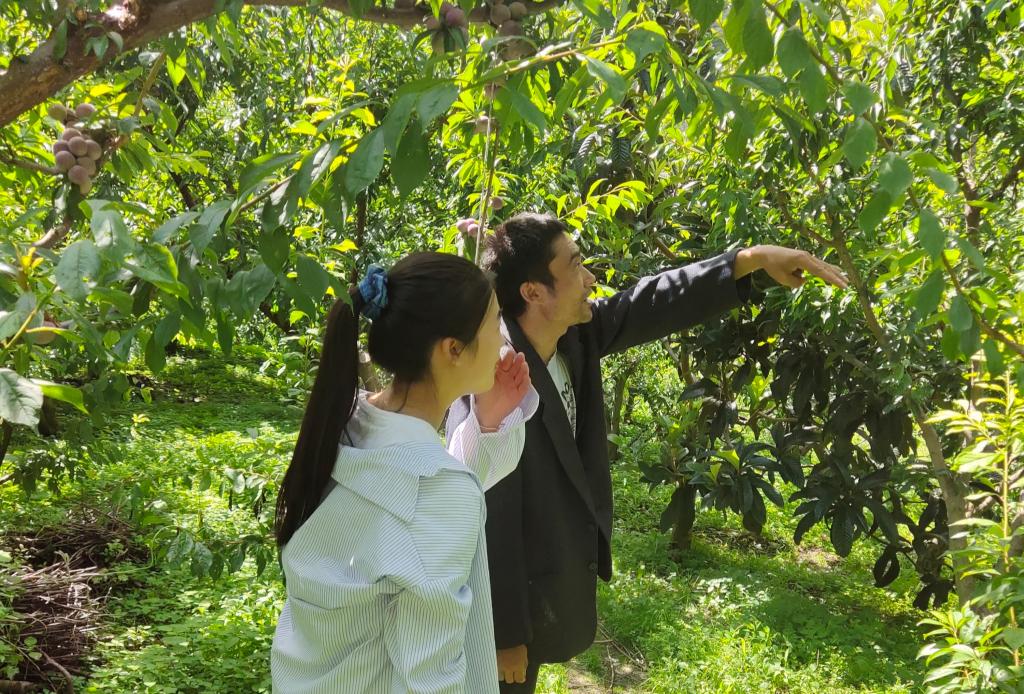 图为返家乡实践小组成员在李子地里听当地果农晏大叔介绍今年茂县李的生长和挂果情况。中国青年网通讯员李洋摄