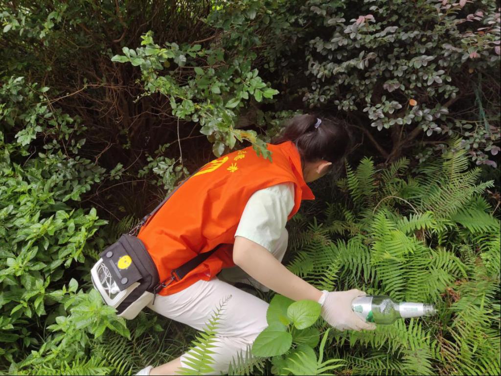 图为返家乡实践小组成员在草丛中捡拾被他人随意丢弃的垃圾。中国青年网通讯员 李洋 摄