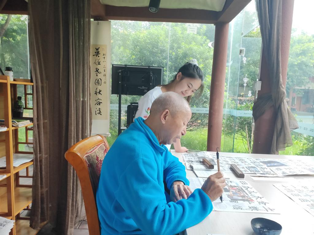 图为老人教返家乡实践小组成员写毛笔字,并交流他的写字心得。中国青年网通讯员李洋摄
