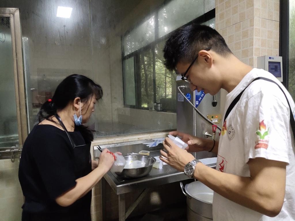 图为返家乡实践小组成员和食堂大妈一起查看各位老人的饮食禁忌和封装当日的午餐样品。中国青年网通讯员蒋雷摄