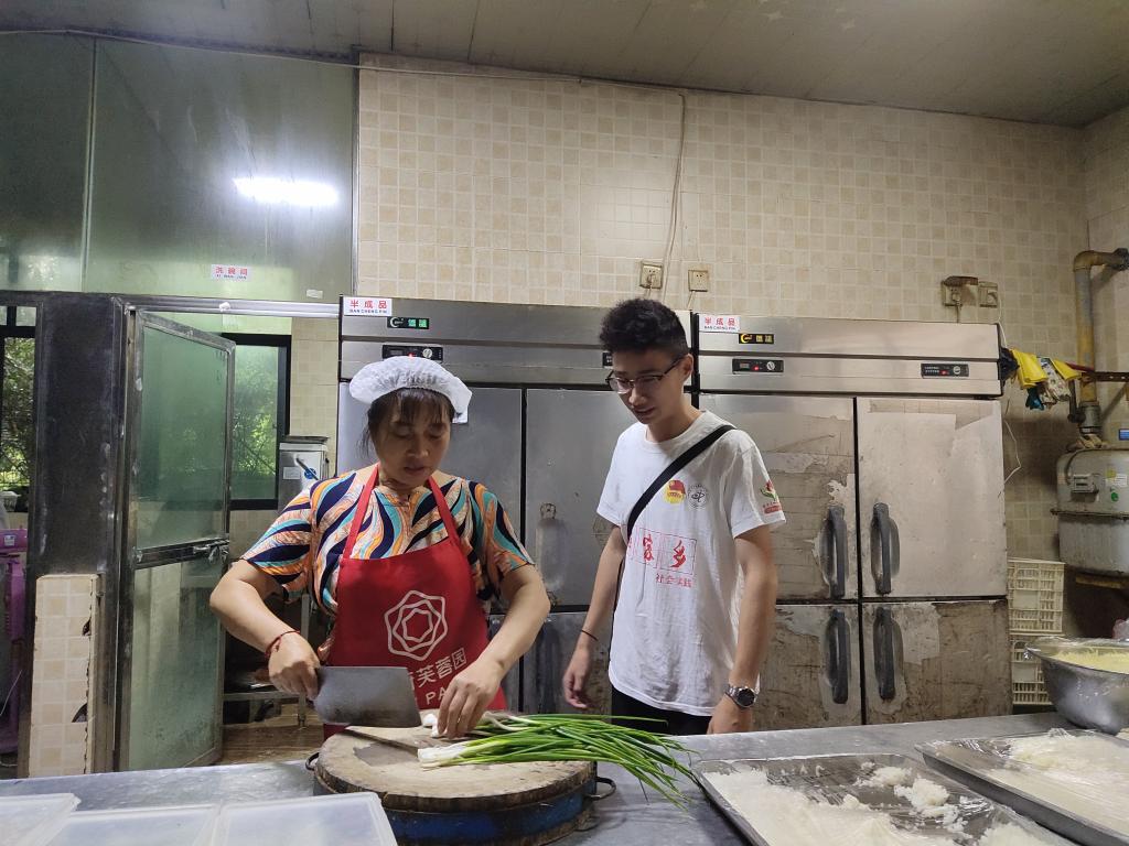 图为返家乡实践小组成员和食堂阿姨一起准备老人的午餐。中国青年网通讯员蒋雷摄