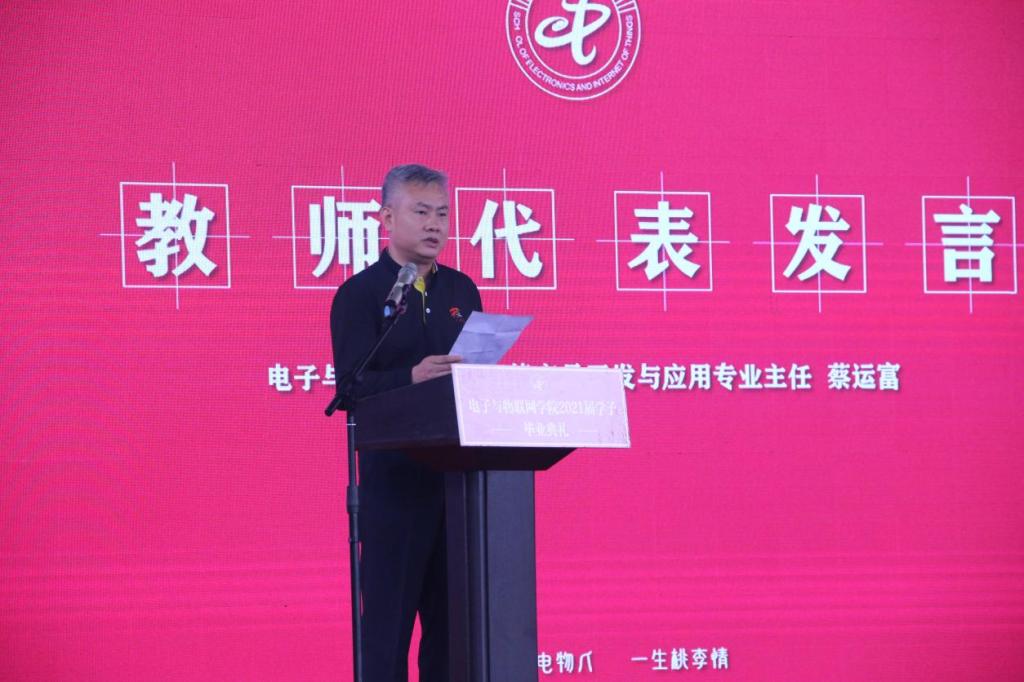 教师代表、学院智能产品开发与应用专业主任蔡运富老师深情回顾了2021届毕业生三年来的学习和成长之路。他送给即将远行的毕业生们几句叮嘱:一是学习学习再学习。知识创造财富、知识改变人生,新的事物将层出不穷,每天都会遇到新的挑战,学习是最好的解决手段,需要一生坚持。二是前进前进再前进。人生的道路不会一帆风顺的,前面一定有坎坷曲折、也一定会有激流险滩,当累了可以歇一歇,歇好了又要精神抖擞的再度前进。蔡运富老师谆谆教诲,肺腑之言,道说出了全体老师的心声。