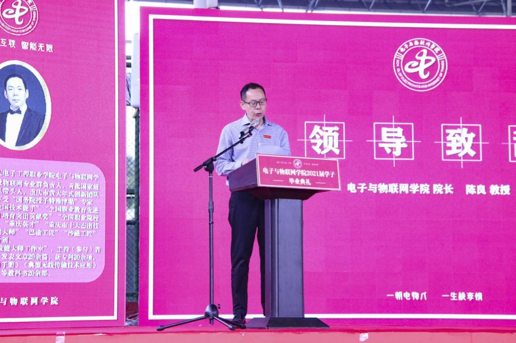 在全场热烈的掌声中,经理陈良教授为本次毕业典礼辞。他代表学院向2021届1225名同学顺利毕业表示热烈的祝贺,向倾心尽力培育同学成才的老师们表示衷心的感谢和崇高的敬意,并与同学们回顾了学院近三年在提质培优、人才培养、文化育人、社会服务等方面取得的发展成就。 陈经理给同学们提出殷切希望:“试玉要烧三日满,辨材须待七年期”,勿忘学院“万物互联,智能无限,卓越匠心,自主共生”的院训,把毕业当入学、把职场当课堂,有板凳要坐十年冷的淡定,有磨剑还需十年功的坚毅,用在校期间的知识积淀去敲开未来的成功之门,用进取的精神去迎接未来未知的挑战,用高超的技能去创造自己的美好人生。