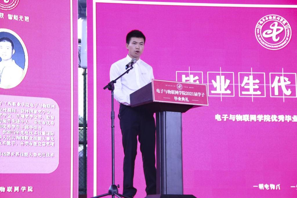 上海第46届世界技能大赛国家队集训选手、第一届中华人民共和国职业技能大赛光电技术项目银牌获得者、优秀毕业生代表李小松同学分享了自己从江西偏远农村站上职业技能竞赛的国赛舞台,步步实现重电梦,技能成才梦的故事,表达了对母校、老师、同学和父母的深深恩情,希望同学们时刻内化学院“卓越、匠心、自主、共生”的理念,牢记着母校“厚德强能,求实创新”的校训,传承“龙翔马跃,博润志远”的人文精神,弘扬“思源致远,员工共进”的员工励志文化,在自己热爱的领域勇攀高峰,逐梦的道路上永不止步。