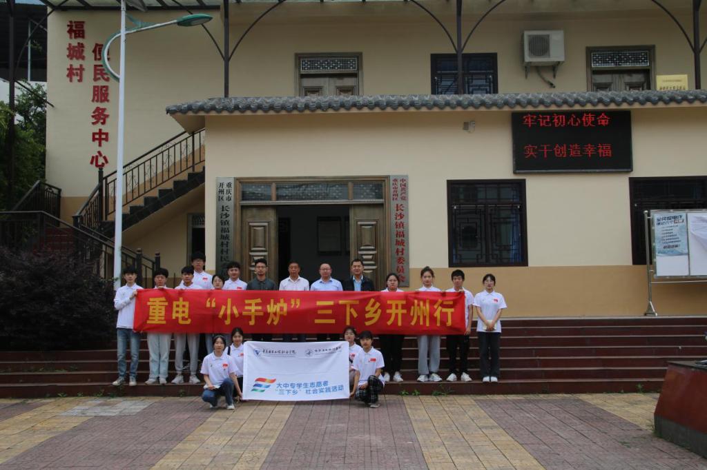 图为重电“小手炉”实践团队在福城村与当地村委书记及开州区人大两位老师合影留恋。