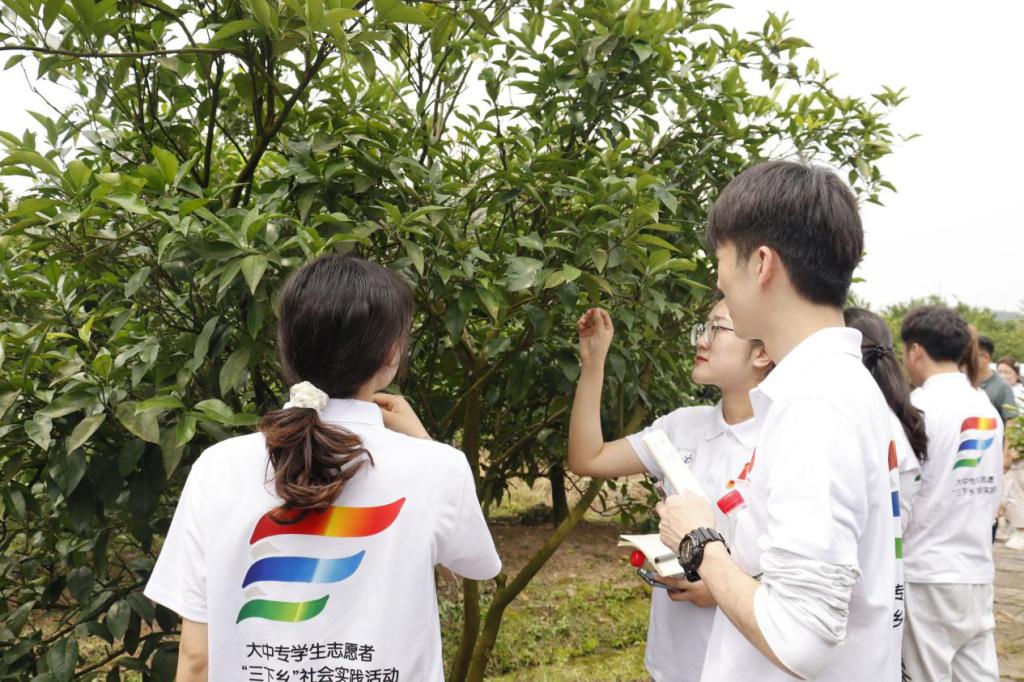 图为“小手炉”队员们正在“万亩橘海”柑橘种植基地查看柑橘植株生长情况。