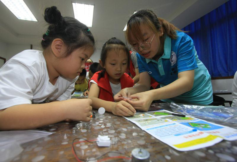 图为队员帮助小朋友制作发电机,并细心指导该怎么安装才能够更加的省时省力。