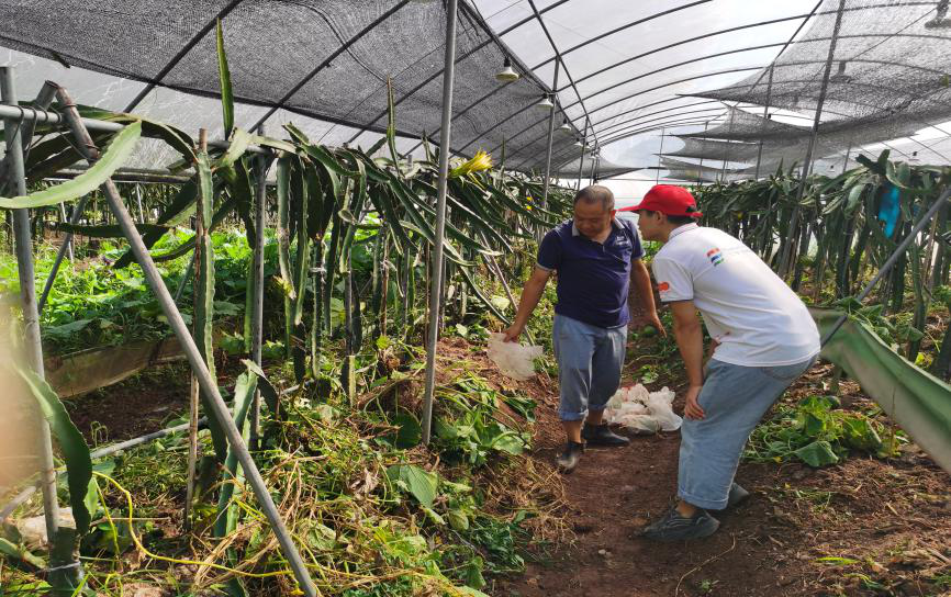 张华大哥告诉队员,由于技术不成熟、不懂水果的习性、天气不稳定等因素,农场在创立初期遭受了很大的打击。比如,2018年的冬季,因为不了解火龙果的生长环境,没有做好温度管控,导致10亩红心火龙果收成欠佳,前期投入的成本全都打了水漂。2020年夏季,雨水特别多,由于农场地势较低,积水排不出去,导致在农场种植的西瓜、葡萄、圣女果、草莓等水果收成欠佳。