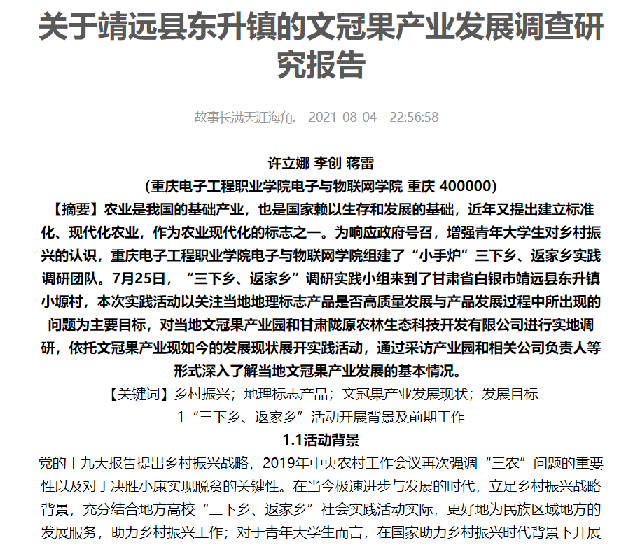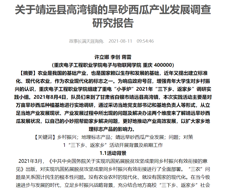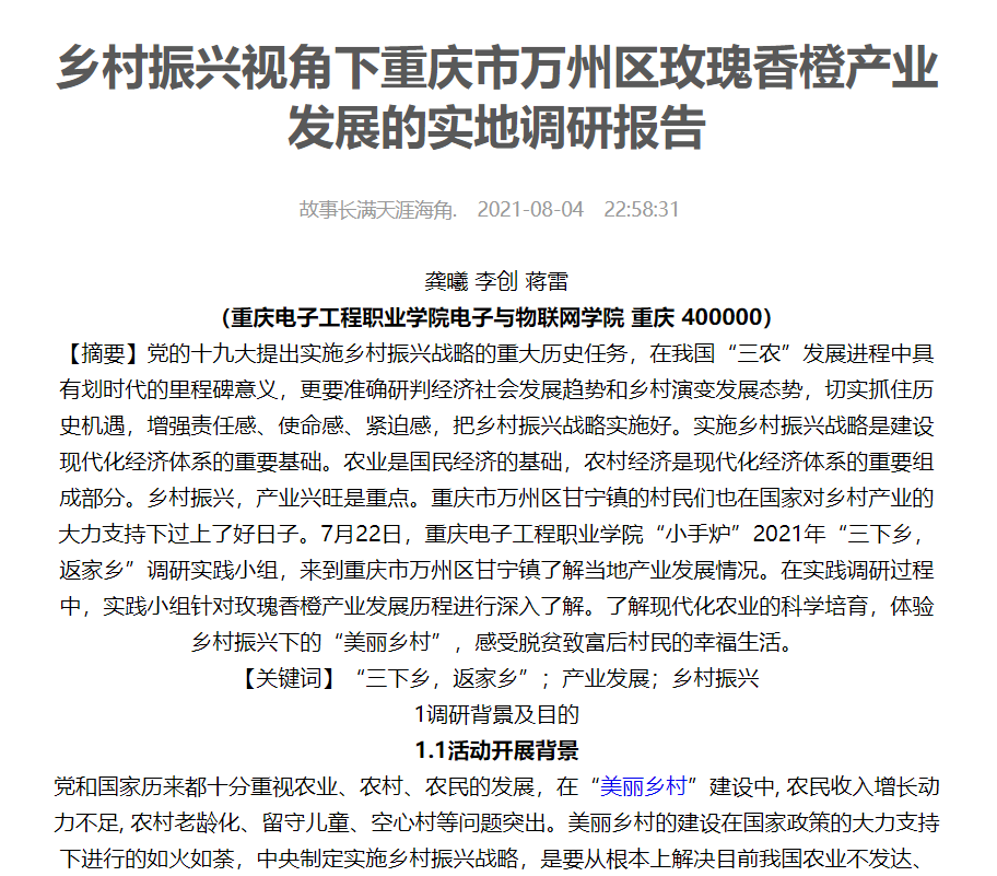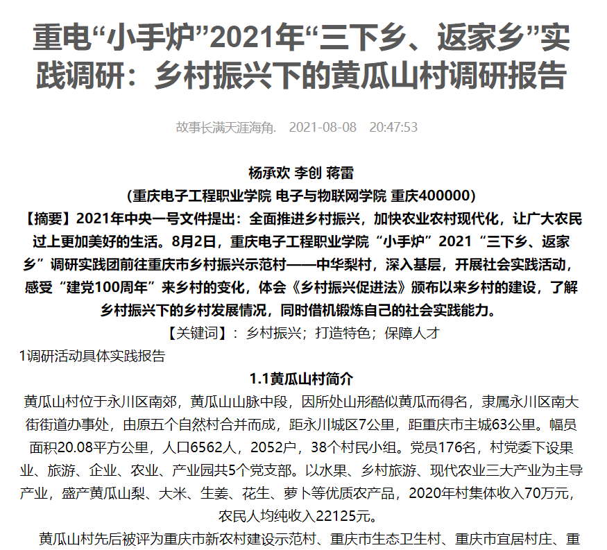 党的十九大报告指出,实施乡村振兴战略,要坚持农业农村优先发展,按照产业兴旺、生态宜居,乡风文明、治理有效,生活富裕的总要求,建立健全城乡融合发展体制机制和政策体系,加快推进农业农村现代化。随着“乡村振兴战略”的提出和稳步实施,乡村发展被摆放到了一个更高的高度,一些乡村也发生巨变,取得了可喜的成绩:路变宽了,产业变多了,居住环境变好了,文化设施也多了,乡村越来越美丽,越来越有活力。重庆电子工程职业学院HAHA体育“小手炉”2021年“三下乡、返家乡”调研实践小组9位成员,回到自己的家乡开展社会实践调研活动。在重庆市、河北省、甘肃省等16个乡镇街道社区进行实践调研,最终形成了45763余字的文字材料,并成功发表于中国青年网、老员工网报等国家主流媒体。