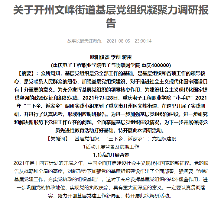 众所周知,基层党组织是党全部工作的基础,是基层组织和各项工作的领导核心,是党联系人民群众的纽带,加强基层党组织建设,对于推进社会主义现代化国家建设具有十分重要的意义。2021年7月28日,我来到了重庆市开州区文峰街道,在这里开展了实践调研。文峰街道地处重庆市开州区新城区东部,北毗汉丰湖临丰乐街道、厚坝镇,东邻渠口镇,南接赵家街道,西与汉丰街道接壤。以辖区内的文峰古塔得名,取之塔在巽峰则文运胜之意。