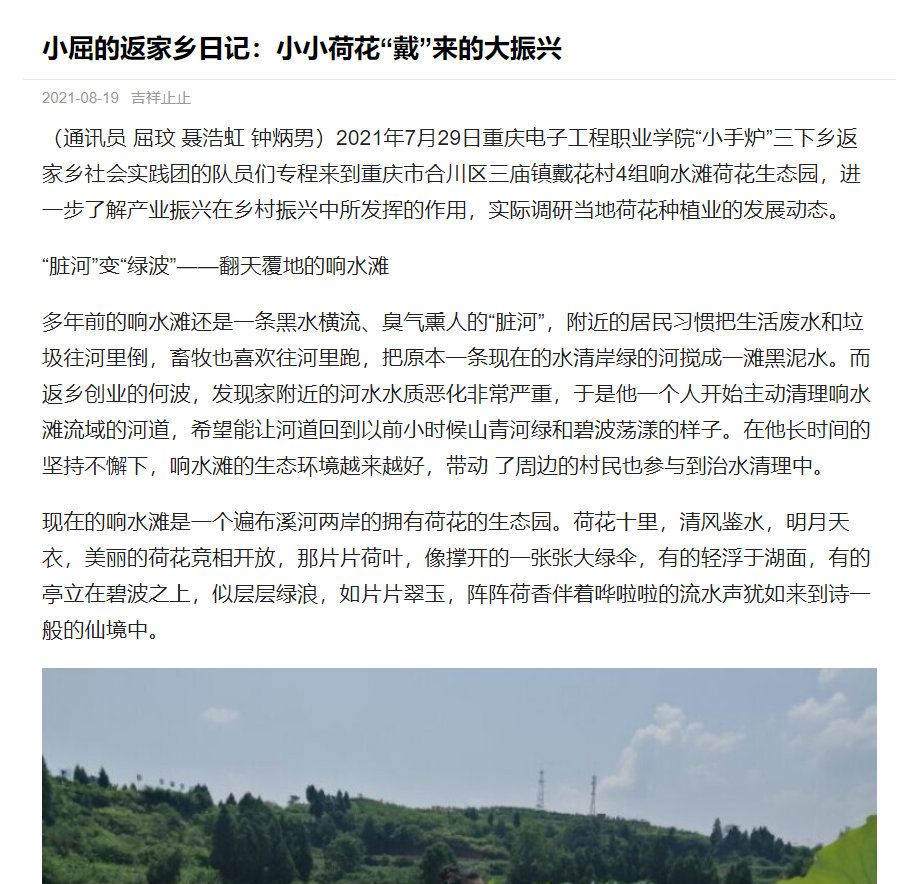 2021年7月27日我来到重庆市合川区三庙镇戴花村4组响水滩荷花生态园,进一步了解产业振兴在乡村振兴中所发挥的作用,实际调研当地荷花种植业的发展动态。多年前的响水滩还是一条黑水横流、臭气熏人的“脏河”,附近的居民习惯把生活废水和垃圾往河里倒,畜牧也喜欢往河里跑,把原本一条现在的水清岸绿的河搅成一滩黑泥水。