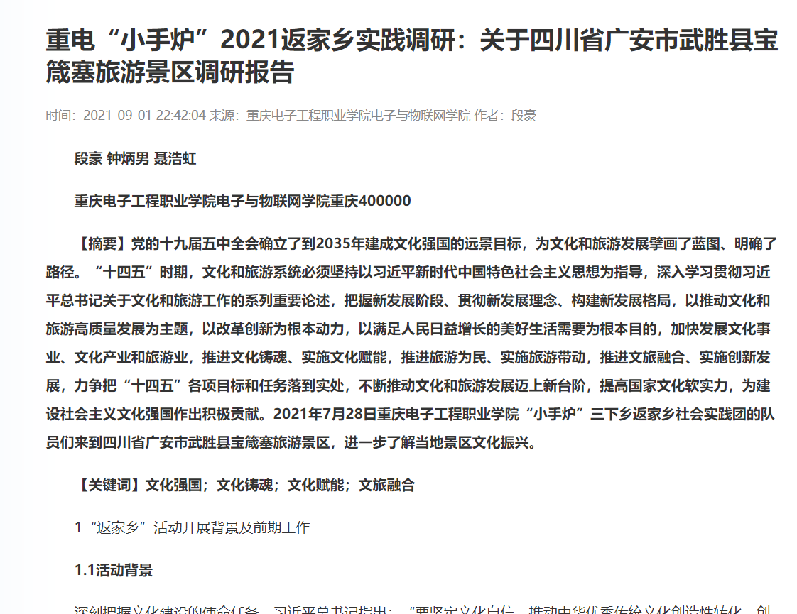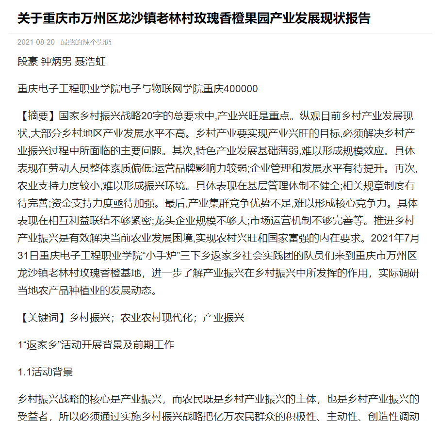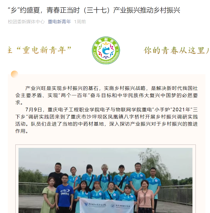 党的十九届五中全会指出,坚持把解决好“三农”问题作为全党工作重中之重,走中国特色社会主义乡村振兴道路,全面实施乡村振兴战略,强化以工补农、以城带乡,推动形成工农互促、城乡互补、协调发展、共同繁荣的新型工农城乡关系,加快农业农村现代化。在去年底召开的中央农村工作会议上,习近平总书记指出,脱贫攻坚取得胜利后,要全面推进乡村振兴,这是“三农”工作重心的历史性转移。做好新时代的“三农”工作,全面推进乡村振兴,必须贯彻落实习近平总书记重要讲话精神和党中央决策部署,把握新形势、明确新任务、展现新作为。重庆电子工程职业学院HAHA体育“小手炉”2021年“三下乡、返家乡”第四调研实践小组12位成员,回到自己的家乡开展社会实践活动。在重庆市、四川省等16个乡镇街道社区进行实践调研,并成功发表于中国青年网、老员工网报的等国家主流平台。