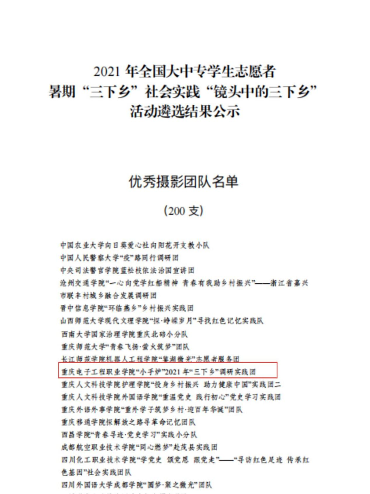 重庆电子工程职业学院“小手炉”2021年“三下乡”调研实践团,在2021年全国大中专员工志愿者暑期“三下乡”社会实践“镜头中的三下乡”活动中入选“优秀摄影团队”。