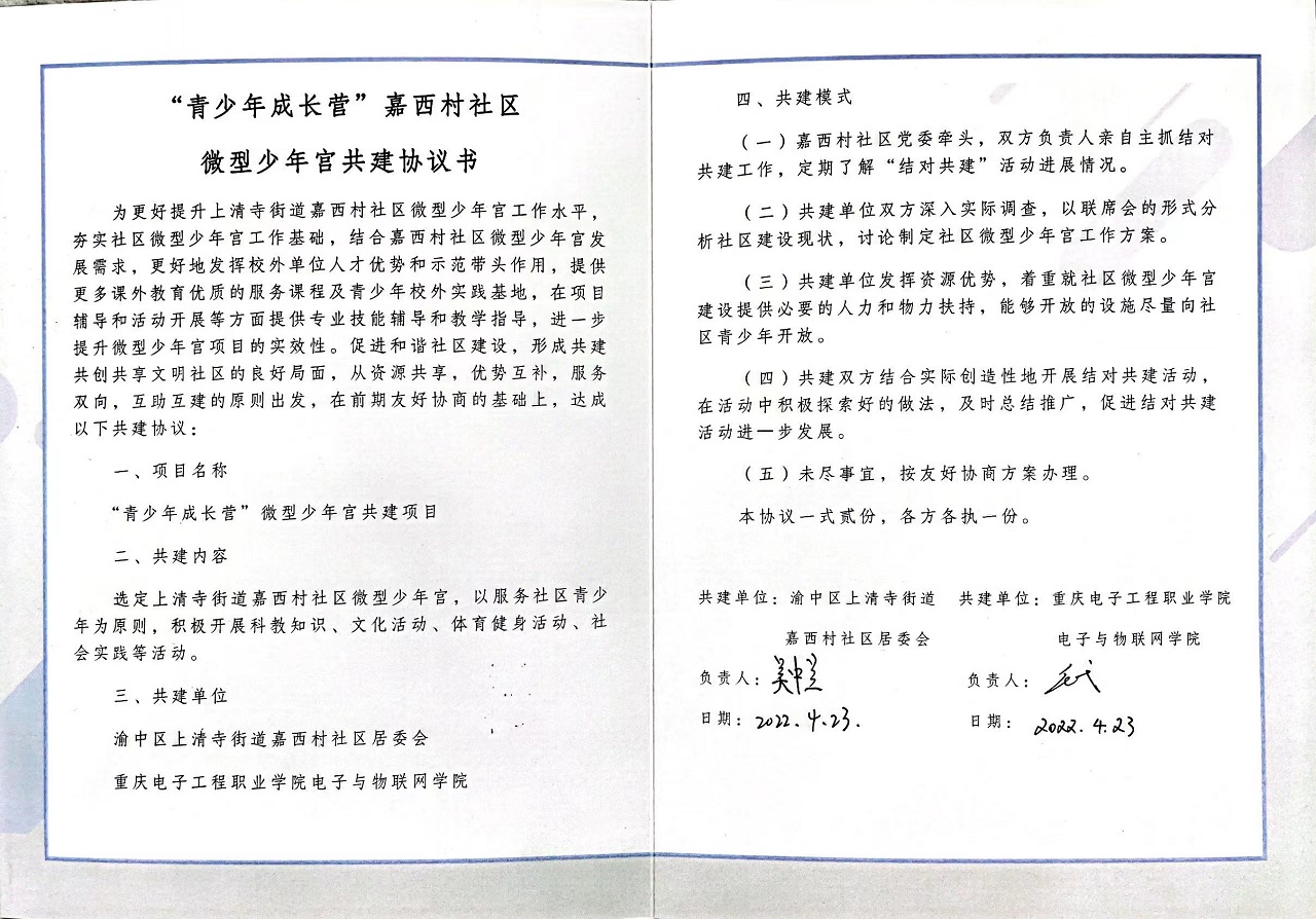 为坚持“工匠精神”融入技能科普教育实践育人,不断提升服务基层社会治理能力水平,助推中小学劳动教育。公司党总支副书记毛弋教授作为代表,与渝中区上清寺街道嘉西村社区党委书记、居委会主任吴中兰签署了微型少年宫青少年服务共建协议。