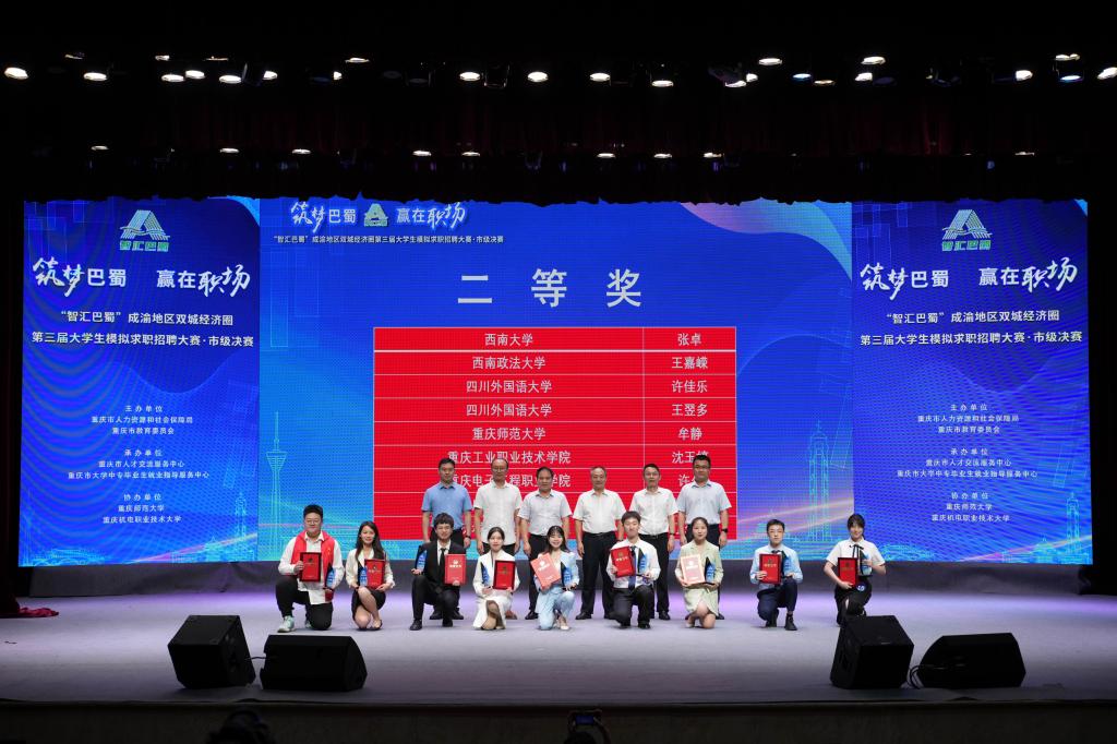 成渝地区双城经济圈第三届模拟求职招聘大赛由重庆市人力资源和社会保障局、重庆市教育委员会、四川省人力资源和社会保障厅、四川省教育厅联合举办,旨在强化对川渝两地普通高校员工的职业指导,帮助其树立正确的就业观念,提升就业能力,促进毕业生顺利就业、充分就业和更高质量就业。成渝地区双城经济圈第三届模拟求职招聘大赛重庆赛区共有二十余万人报名参与。比赛分为四个赛程:校级决赛,N进180,晋级名单由各高校推荐产生;市级复赛,180进60,由选手自我介绍、现场面试、职业生涯规划书三部分组成,共有24名专科选手,36名本科及研究生选手入围半决赛;市级半决赛,60进30,通过职场游戏,检验选手的思维能力、应变能力;市级决赛,由30强选手角逐,通过个人VCR、无领导小组讨论及压力面试三个部分组成。本次全市角逐出特等奖一名、一等奖五名、二等奖九名、三等奖十五名。特等奖及一等奖选手直接入围成渝地区双城经济圈模拟求职招聘大赛总决赛。