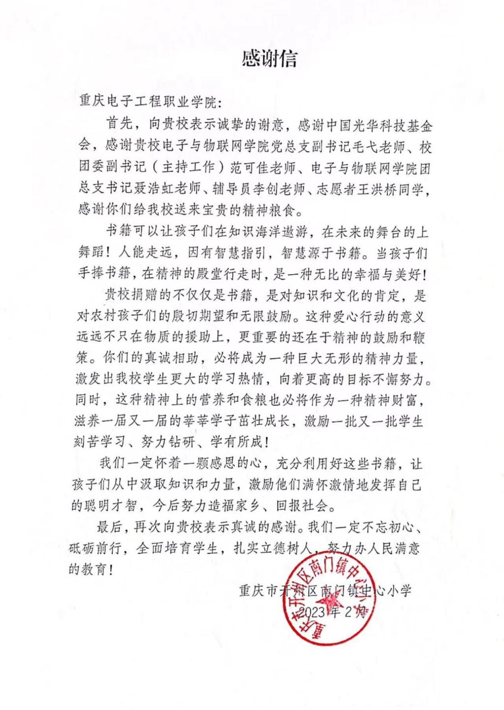 近日,电子与物联网公司党总支副书记毛弋老师、校团委副书记(主持工作)范可佳老师、HAHA体育团总支书记聂浩虹老师、辅导员李创老师、志愿者王洪桥同学代表重庆电子工程职业学院校团委、HAHA体育团总支前往重庆市开州区南门镇中心小学开展图书捐赠活动,并收到来自贵校的感谢信。