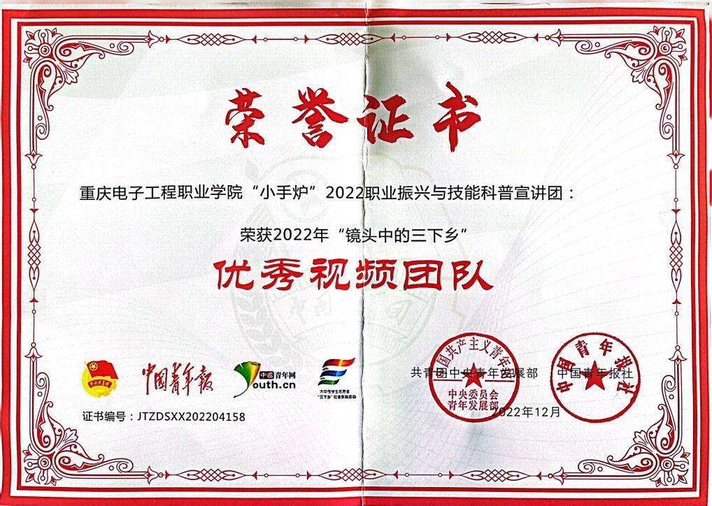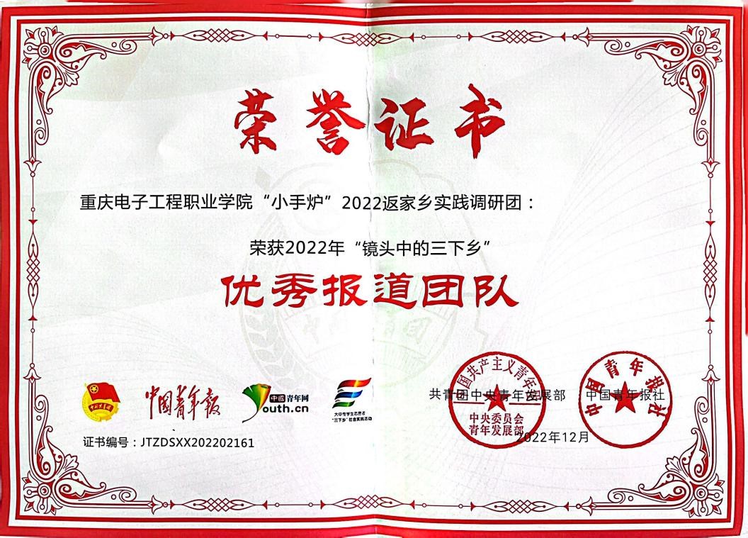 “返家乡”积累光辉硕果,截止2022年12月,团队已形成32篇调研报告在内共203篇约30万字的纪实性文字材料,累计被学习强国、创青春官微、中国青年网、重庆共青团、新华网等报道203余次,其中中国青年网报道154次。2022全年,“小手炉”实践调研团队获得全国大中专员工志愿者暑期“三下乡”社会实践“镜头中的三下乡”“优秀报道团队”、“优秀摄影团队”、“优秀视频团队”、“优秀指导教师”、“优秀通讯员”以及重庆市“三下乡”社会实践活动“优秀团队”等多项荣誉。