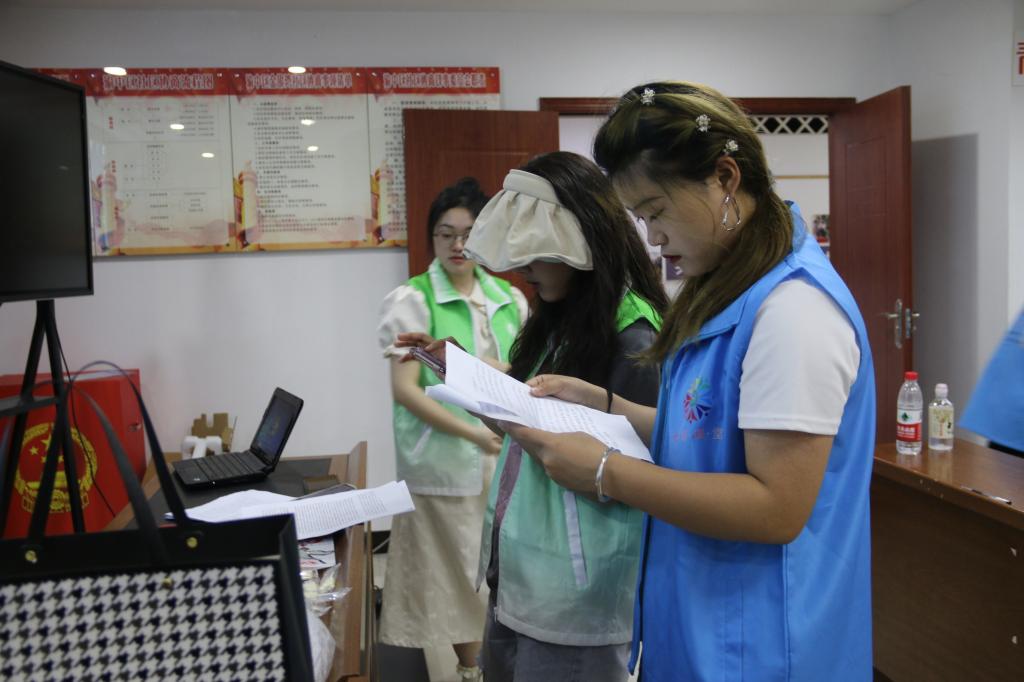 图为七彩课堂分队志愿者与重庆工商大学青年协会志愿者讨论宣讲内容