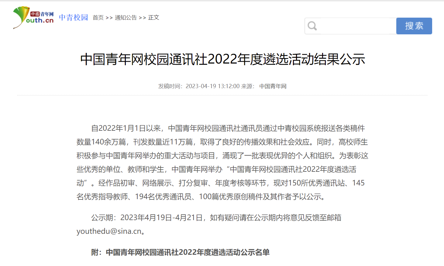 自2022年1月1日以来,中国青年网校园通讯社通讯员通过中青校园系统报送各类稿件数量140余万篇,刊发数量近11万篇,取得了良好的传播效果和社会效应。中国青年网举办“中国青年网校园通讯社2022年度遴选活动”。经作品初审、网络展示、打分复审、年度考核等环节,选出150所优秀通讯站、145名优秀指导教师、194名优秀通讯员、100篇优秀原创稿件及其作者。HAHA体育师生创作的《节水护水守护好家园》《重庆电子工程职业学院:走访调研感受乡村发展》2篇作品被评为“优秀稿件”。(全国共计遴选100件作品)