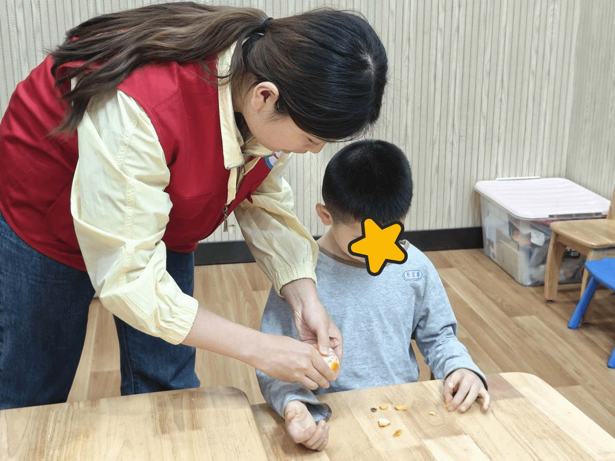 另外一组教授孩子们如何剥橙子皮。她们将橙子分发给孩子们,并一步步演示剥皮的过程。孩子们聚精会神地学习着,然后模仿着志愿者的动作,小心翼翼地剥下了橙子皮。