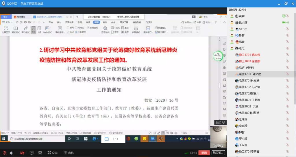 图1 支部党员通过网络视频会议集中学习《中共教育部党组关于统筹做好教育系统新冠肺炎疫情防控和教育改革发展工作的通知》