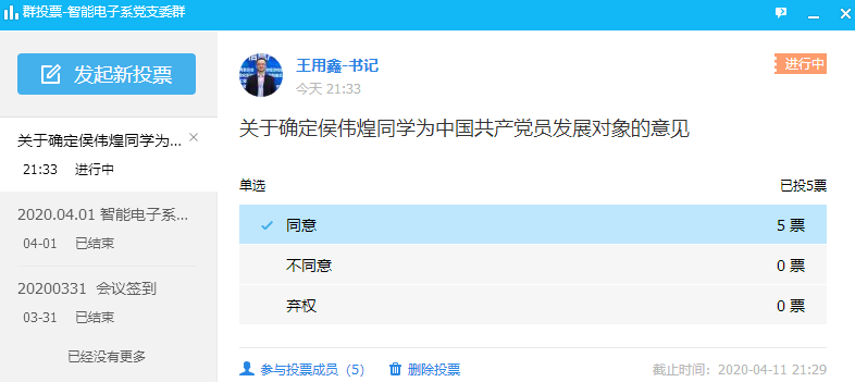 2020年04月10日HAHA体育智能电子系党支部支委会通过在线会议的方式讨论并确定了支部“抗疫”志愿者入党积极分子候伟煌为发展对象。